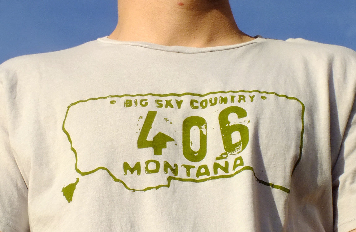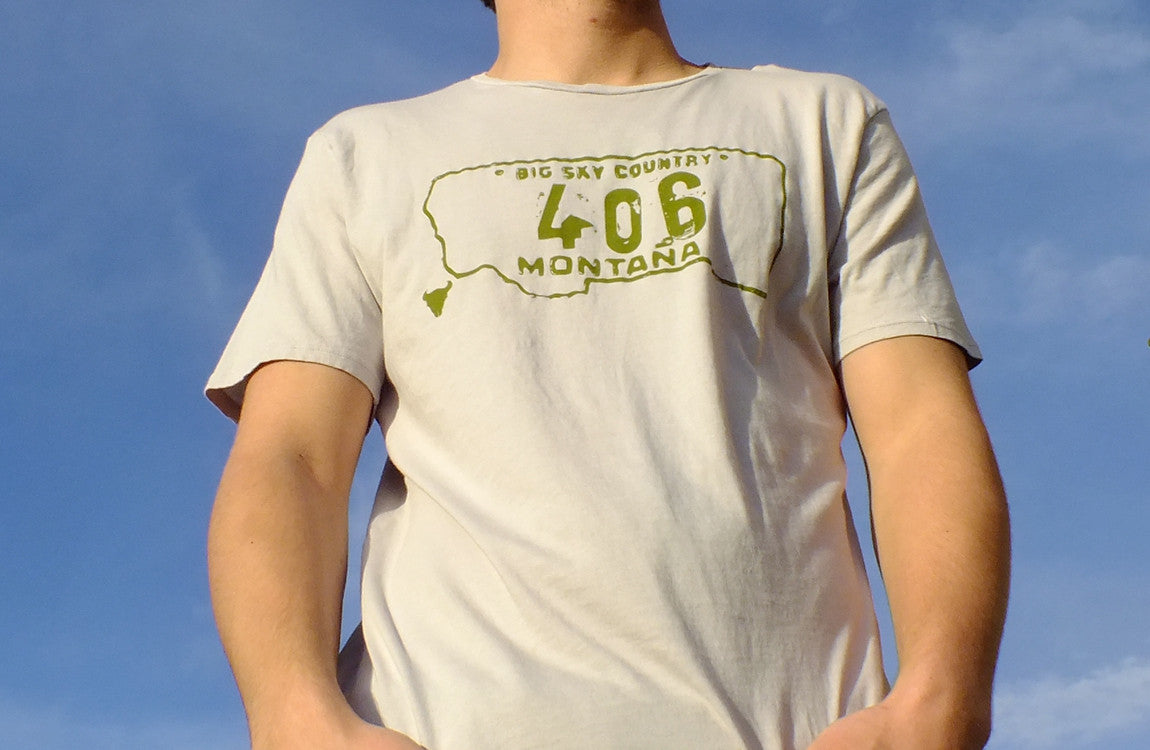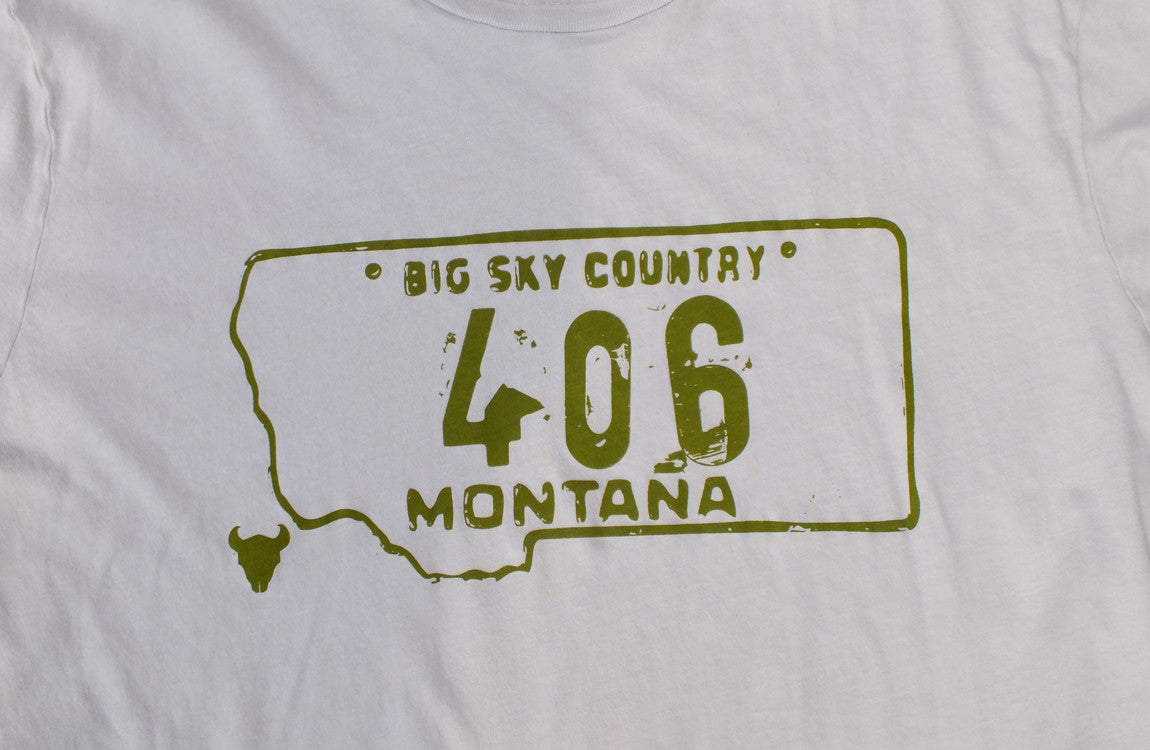 This 406 design features the Montana license plate, complete with the "Big Sky Country" slogan and rustic license plate look. This Montana T shirt is printed on a 100% organic cotton scoop neck Montana tee using a dye discharge process.