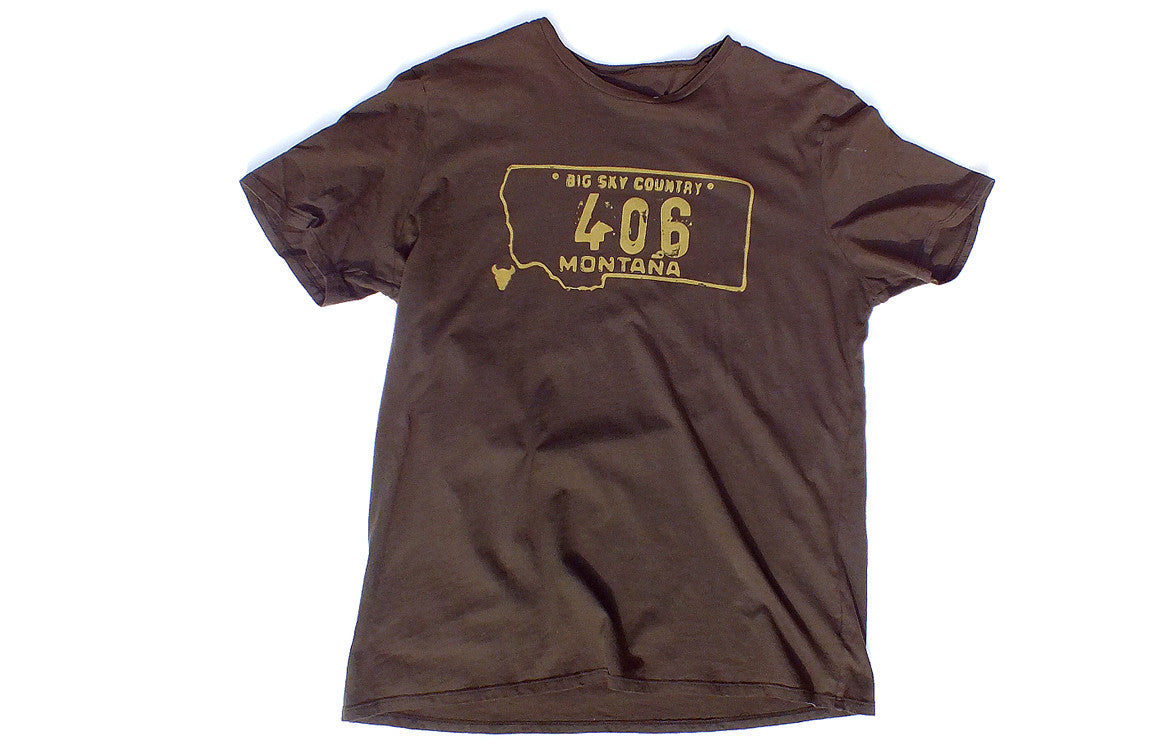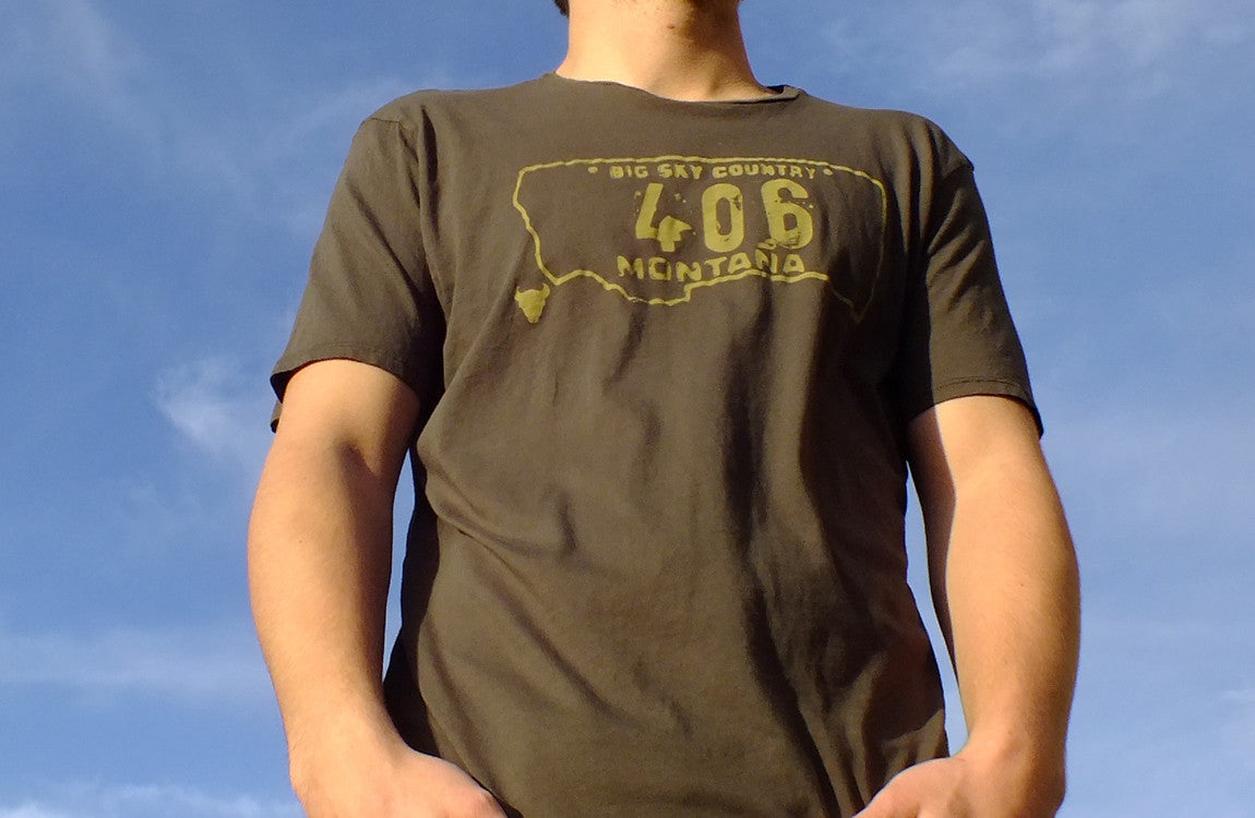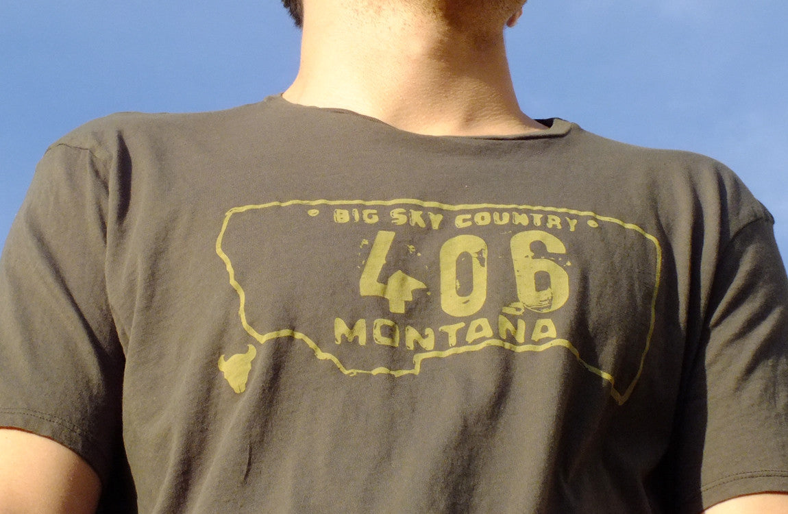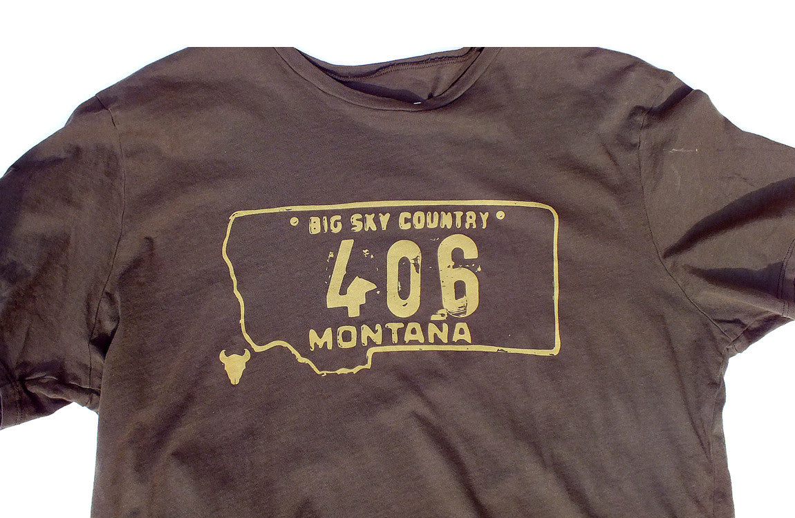 This 406 design features the Montana license plate, complete with the "Big Sky Country" slogan and rustic license plate look. This Montana T shirt is printed on a 100% organic cotton scoop neck Montana tee using a dye discharge process.