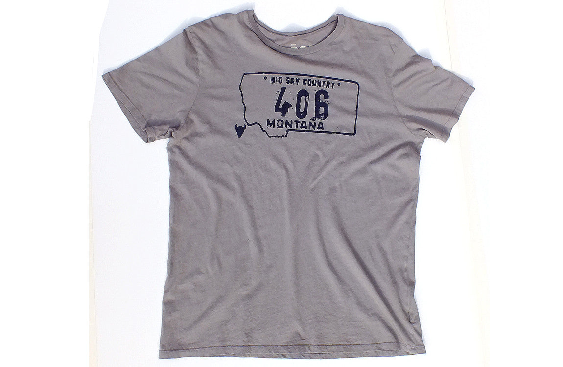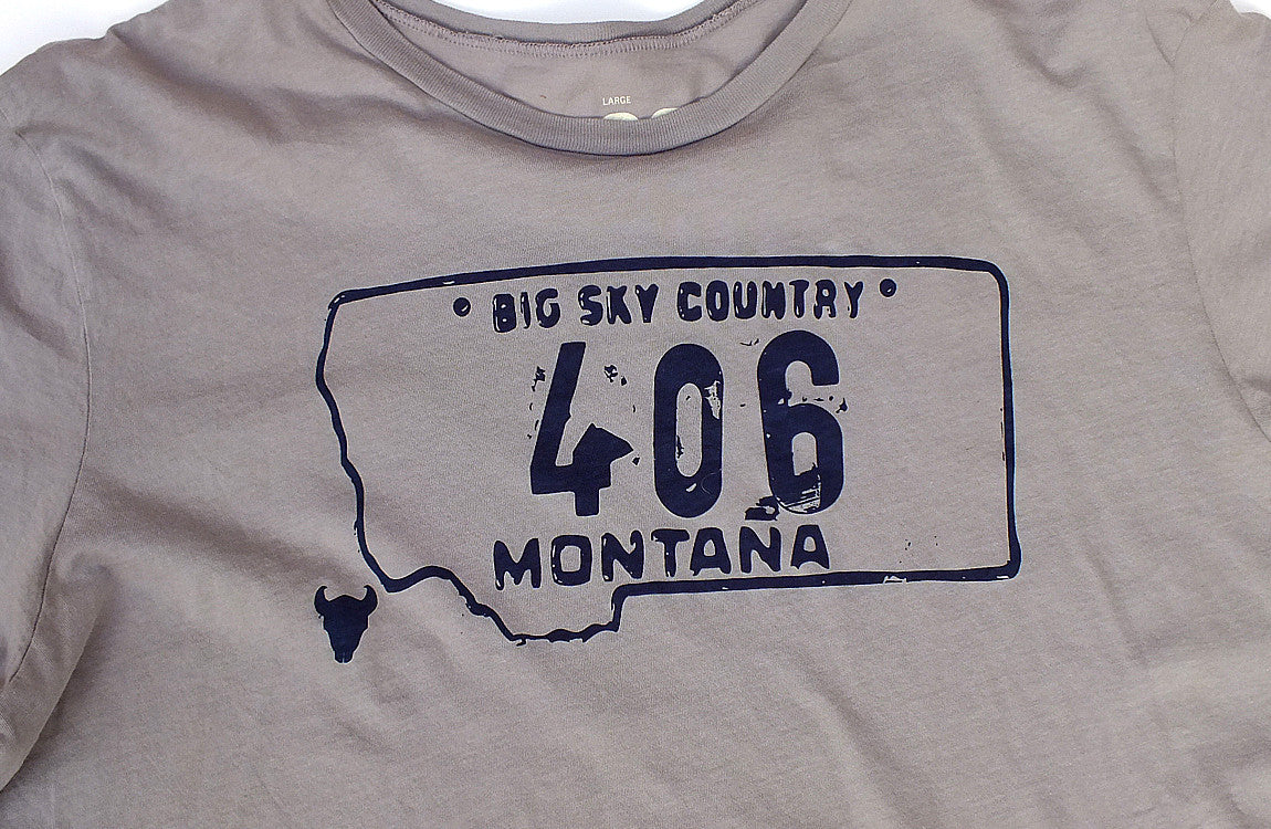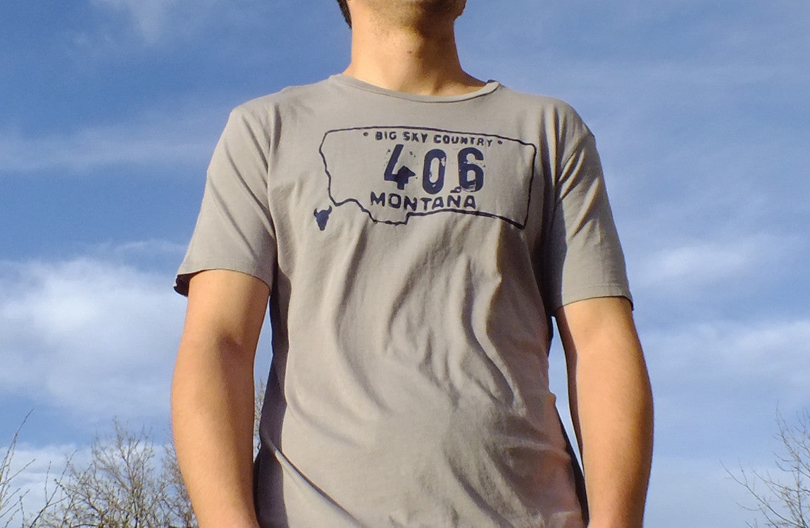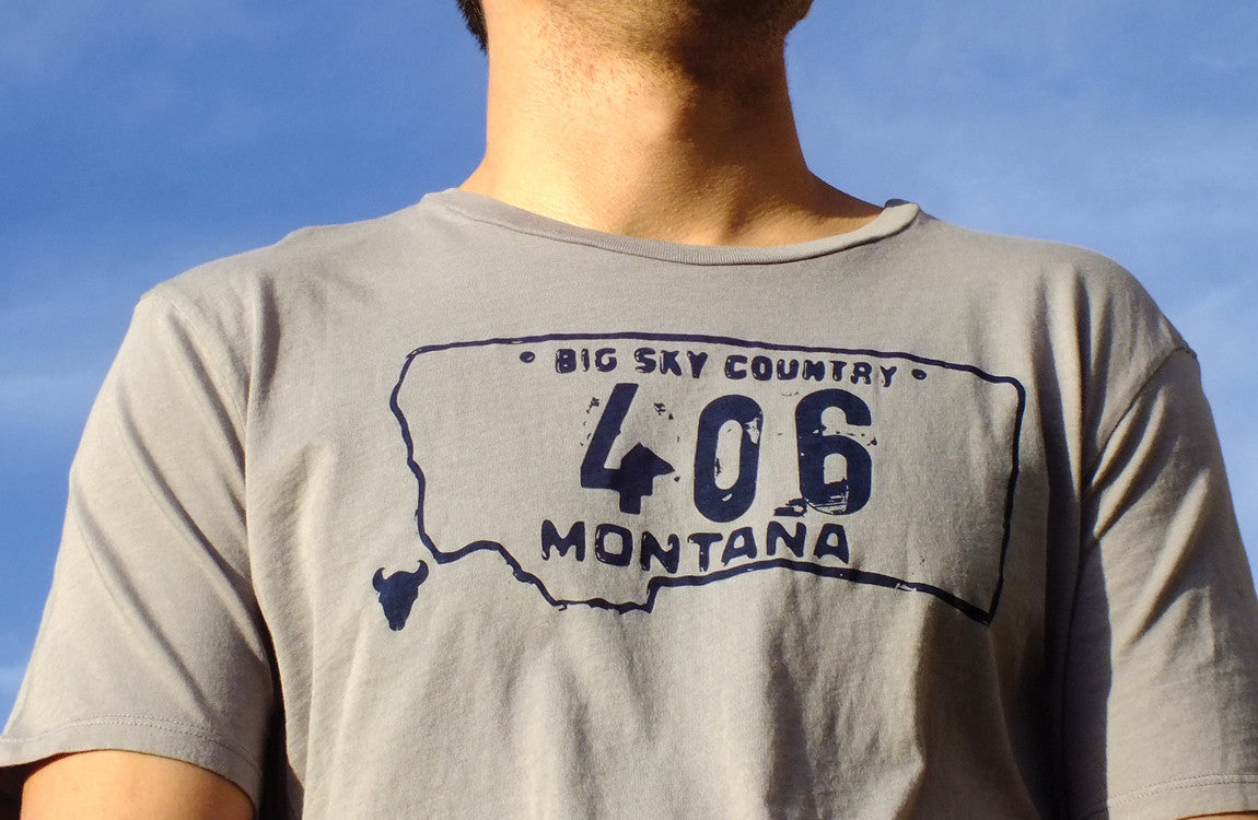 This 406 design features the Montana license plate, complete with the "Big Sky Country" slogan and rustic license plate look. This is printed on a 100% organic cotton scoop neck tee using a dye discharge process.