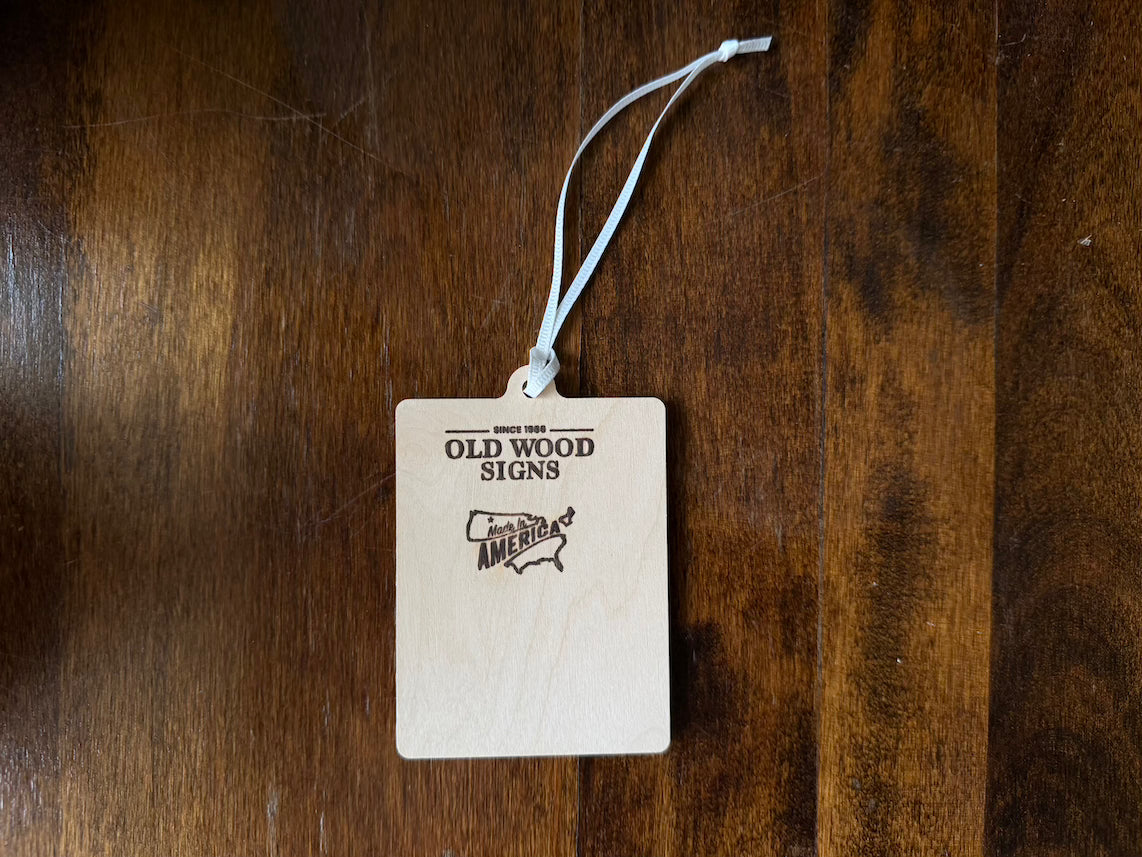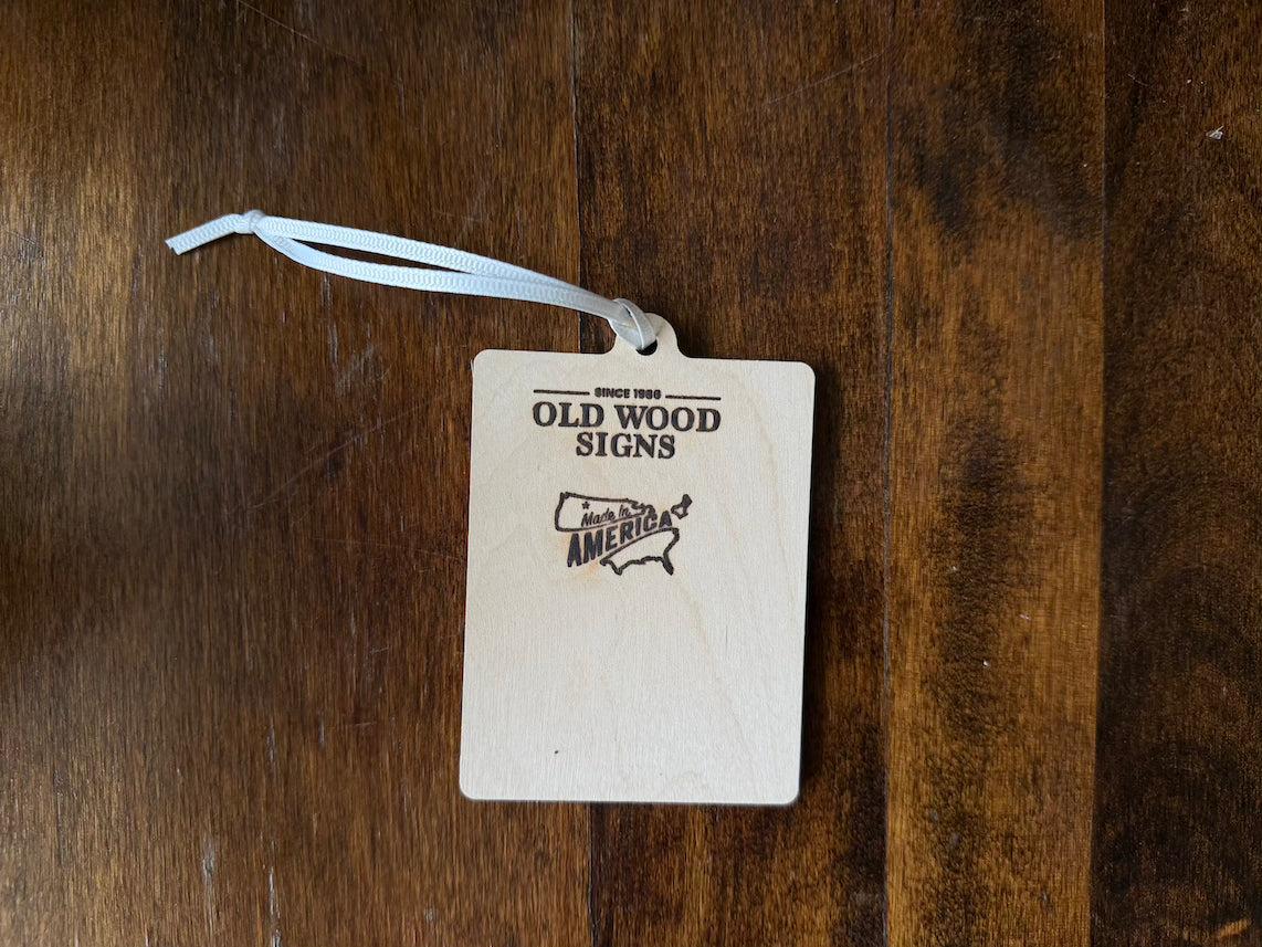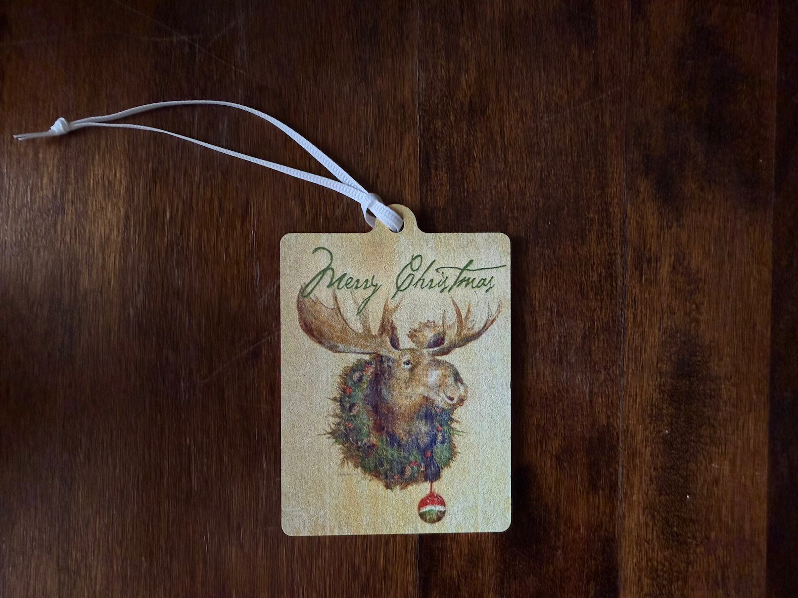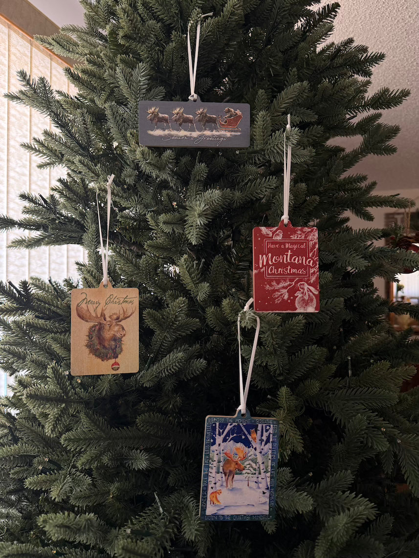 Add rustic Montana charm to your tree with this beautiful wooden ornament featuring a majestic moose adorned with a festive holiday wreath and ornament. "Merry Christmas" appears in elegant script...