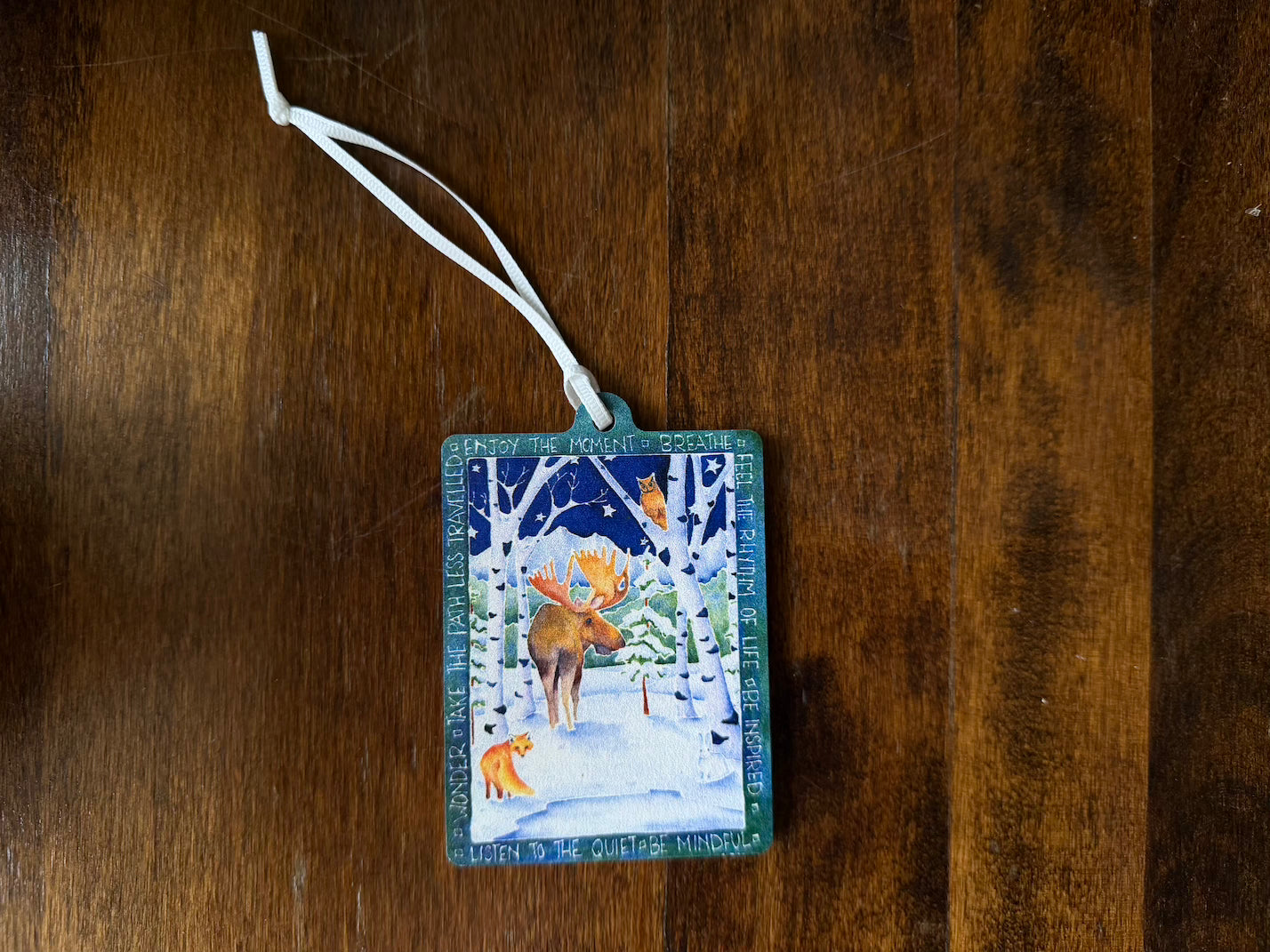 Embrace the peaceful beauty of winter with this enchanting Long Winter Night ornament. A majestic moose stands among snow-covered birch trees under a starlit sky, accompanied by a fox and...