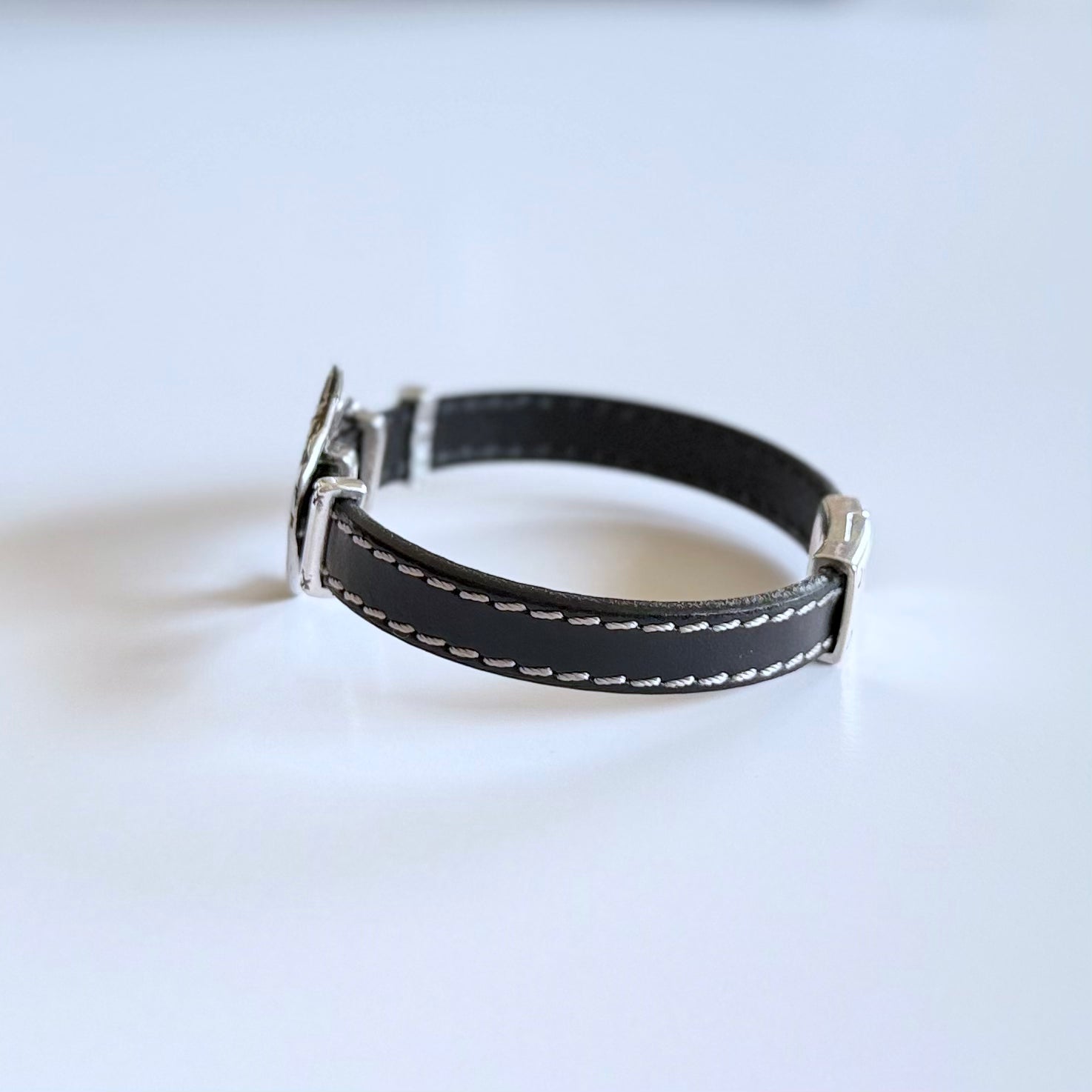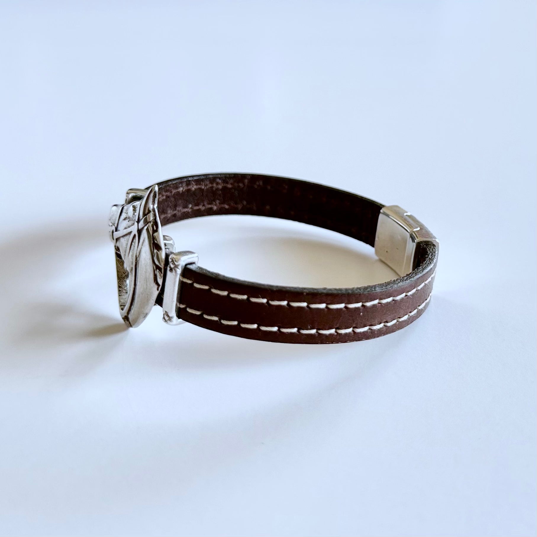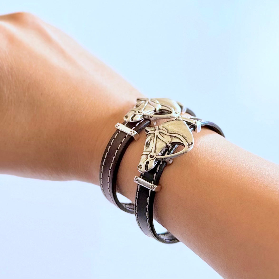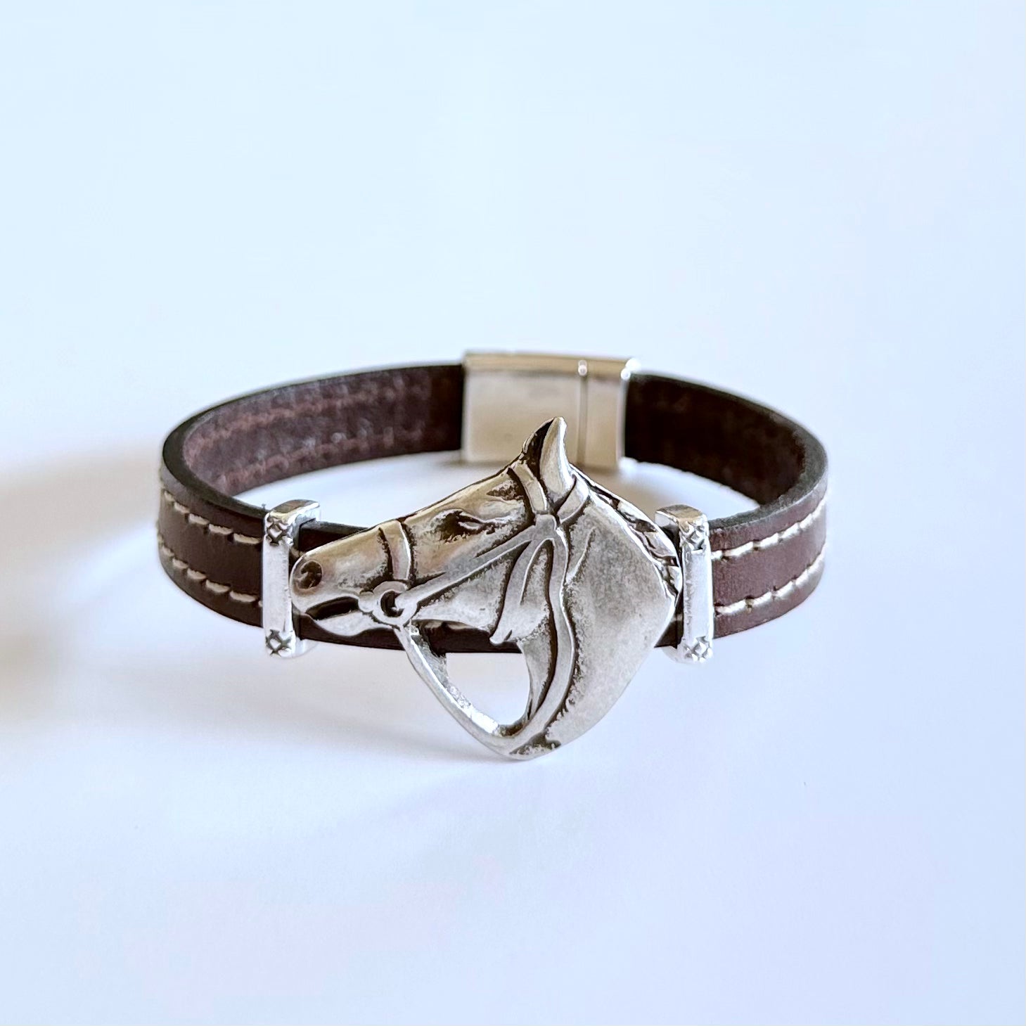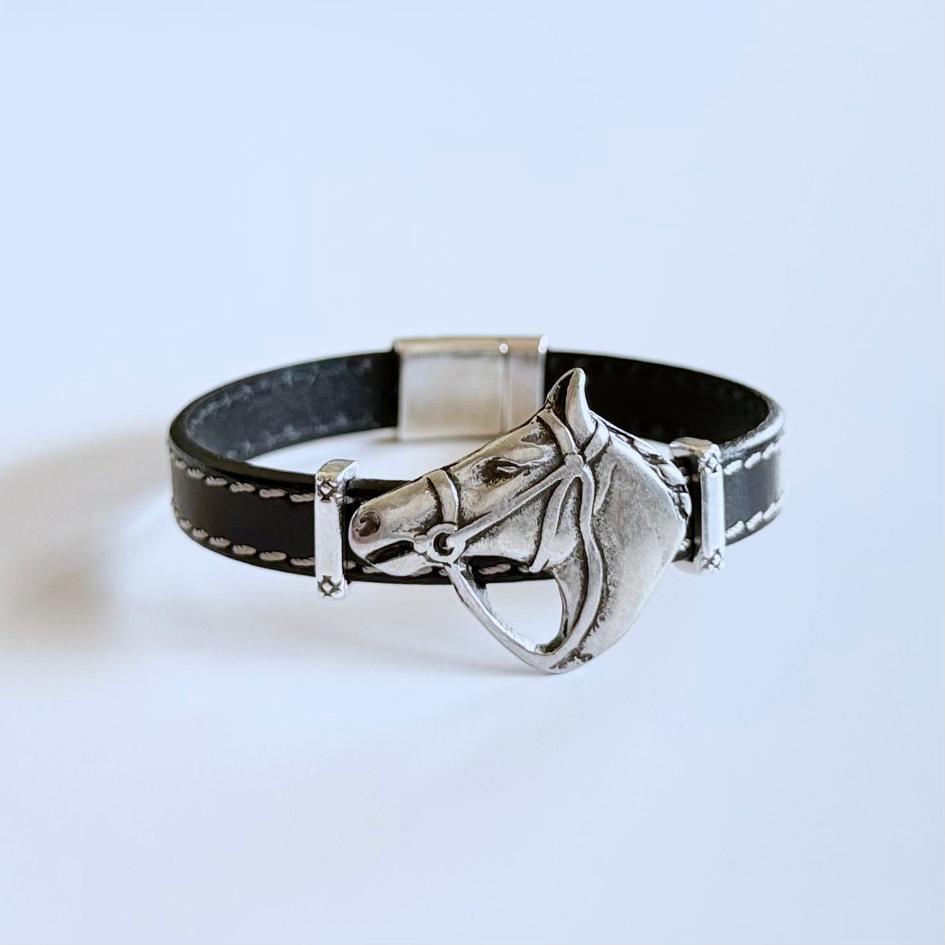 Olive Parker's bracelets are made to order.PLEASE ALLOW 5-7 DAYS FOR PRODUCTION TIME. A striking silver horse head commands attention on a stitched leather band. The antiqued silver finish gives the...