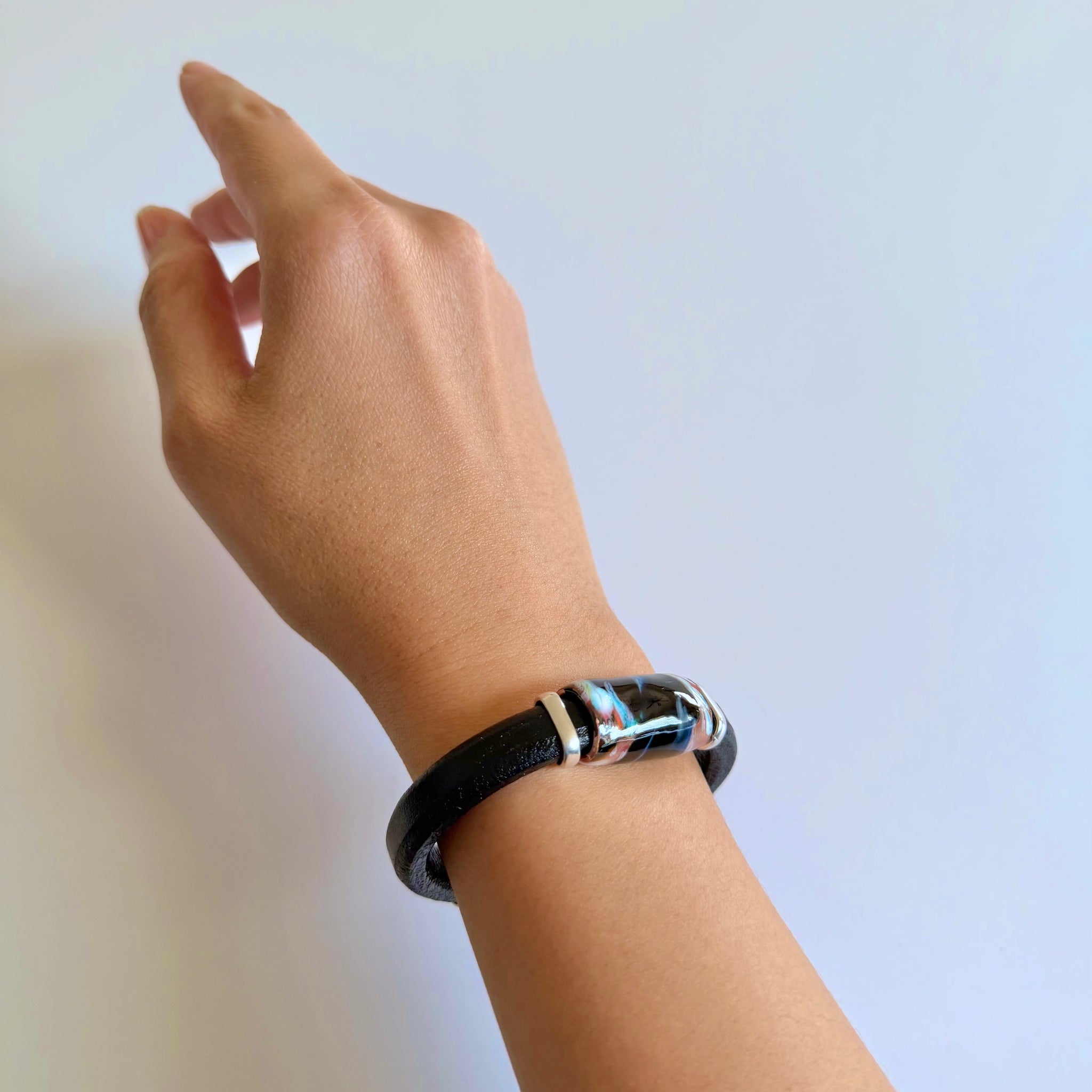 Olive Parker's bracelets are made to order.PLEASE ALLOW 5-7 DAYS FOR PRODUCTION TIME. A one-of-a-kind handblown glass bead takes center stage on a smooth round leather band. Each bead features a deep...