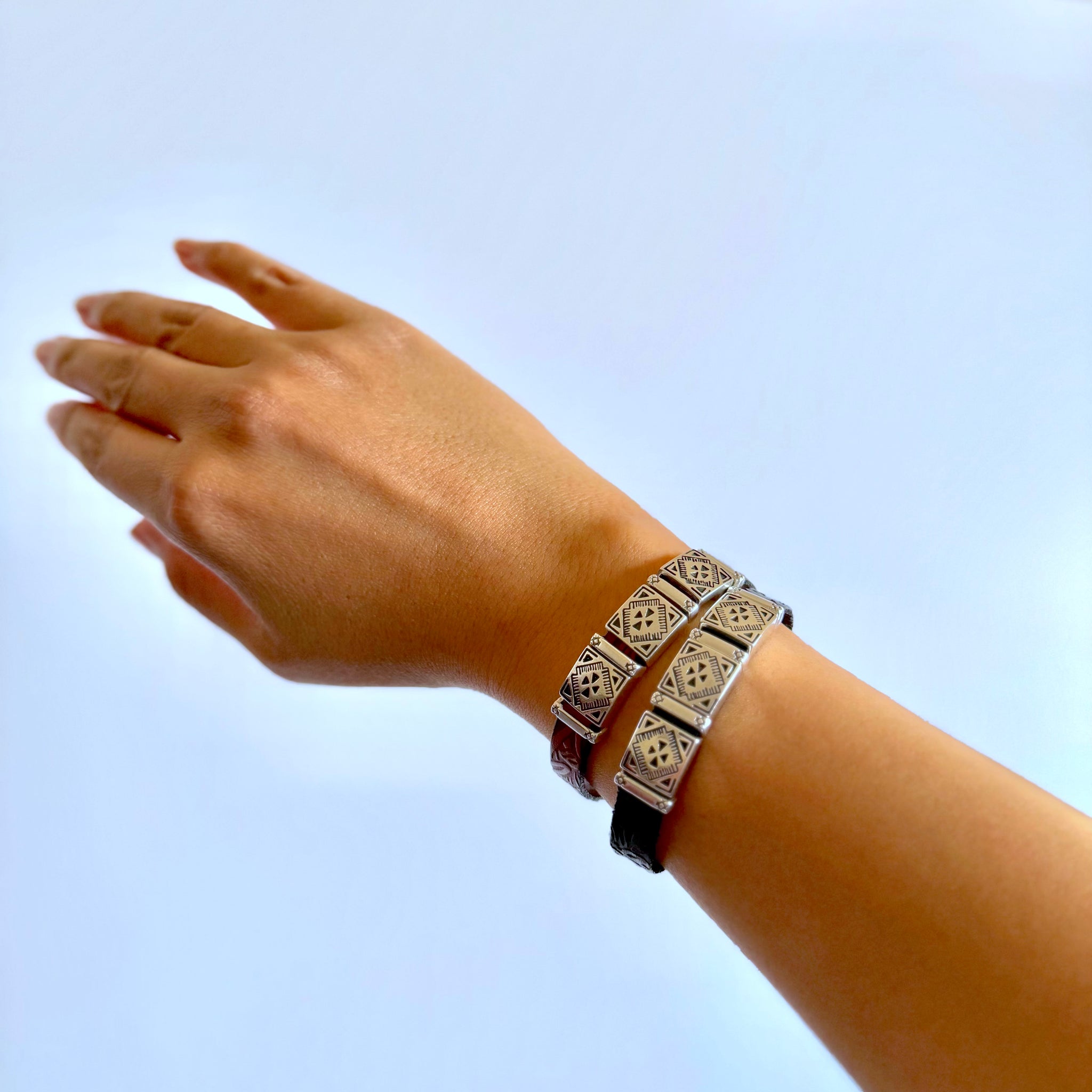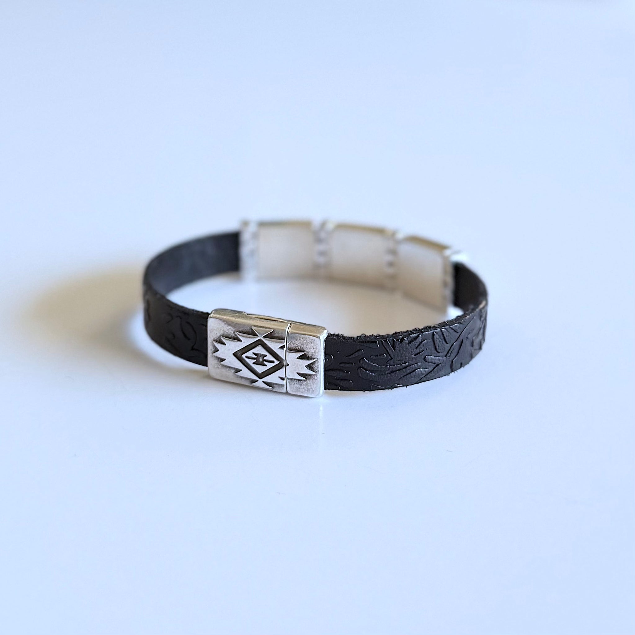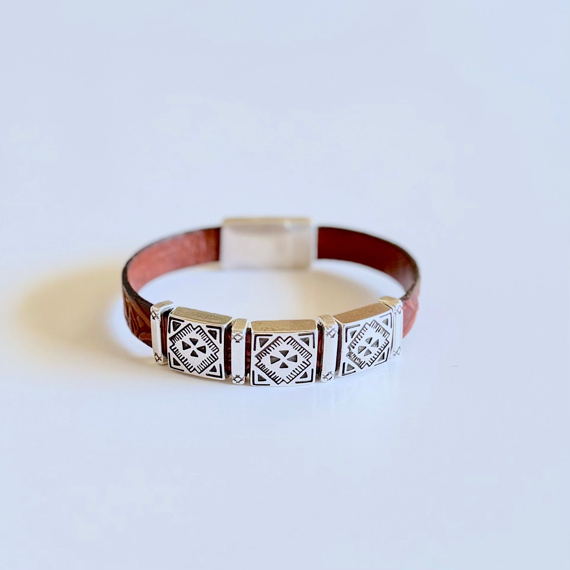 Olive Parker's bracelets are made to order.PLEASE ALLOW 5-7 DAYS FOR PRODUCTION TIME. Western heritage, wrapped around your wrist. Three silver square concho charms sit across a textured leather band, each...