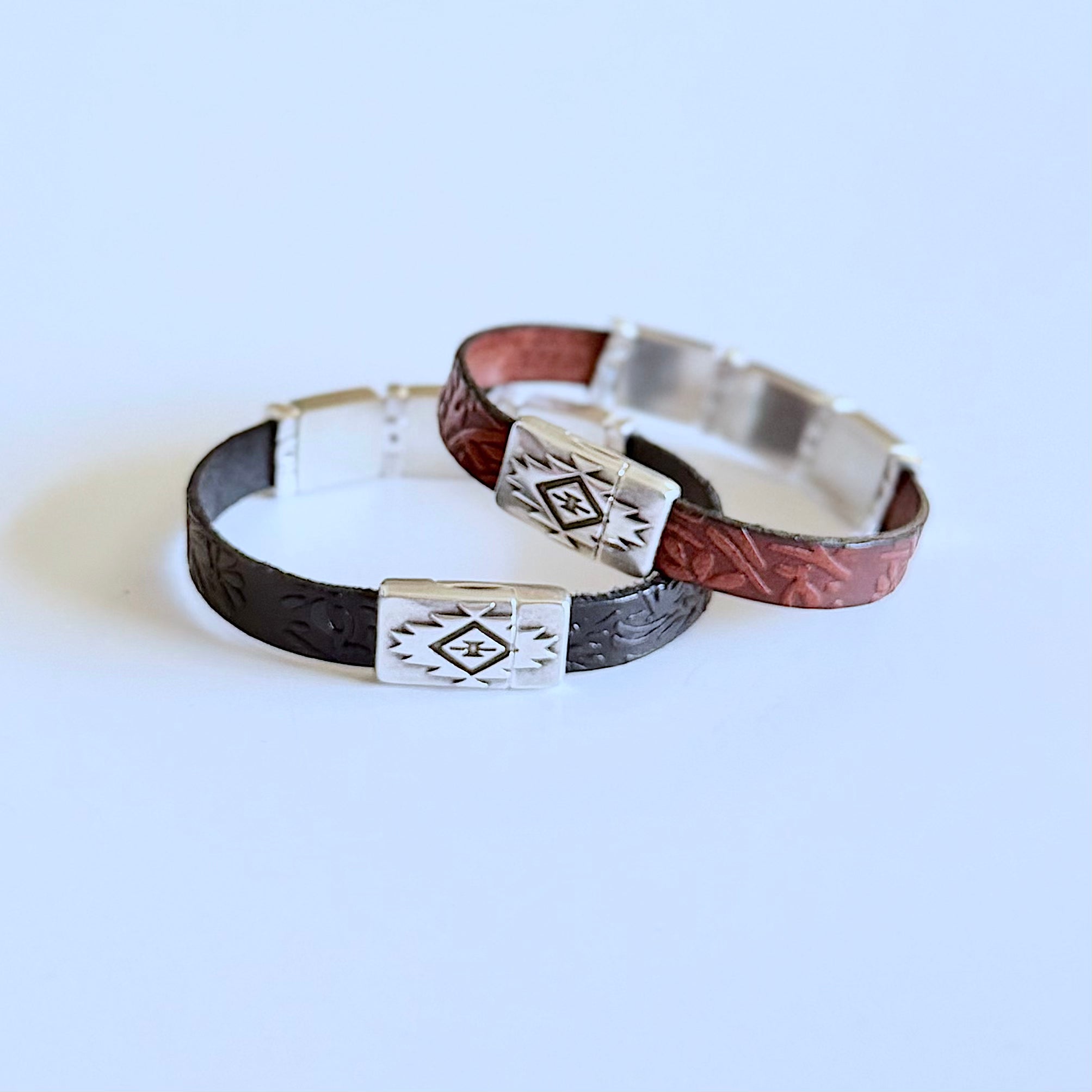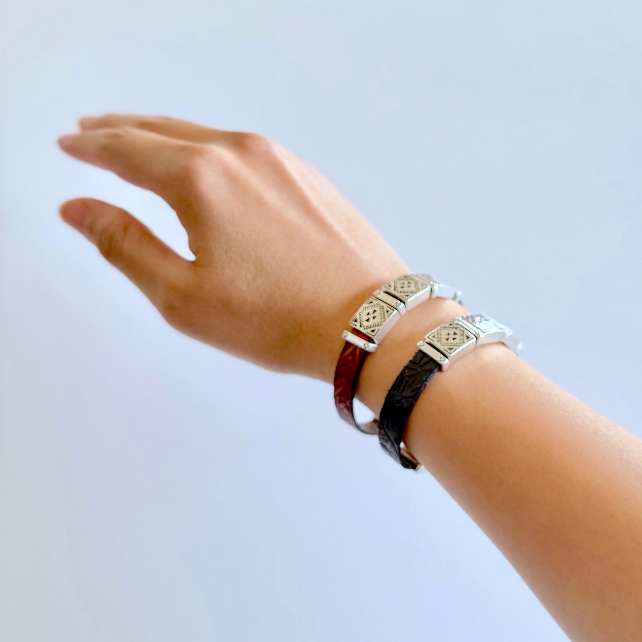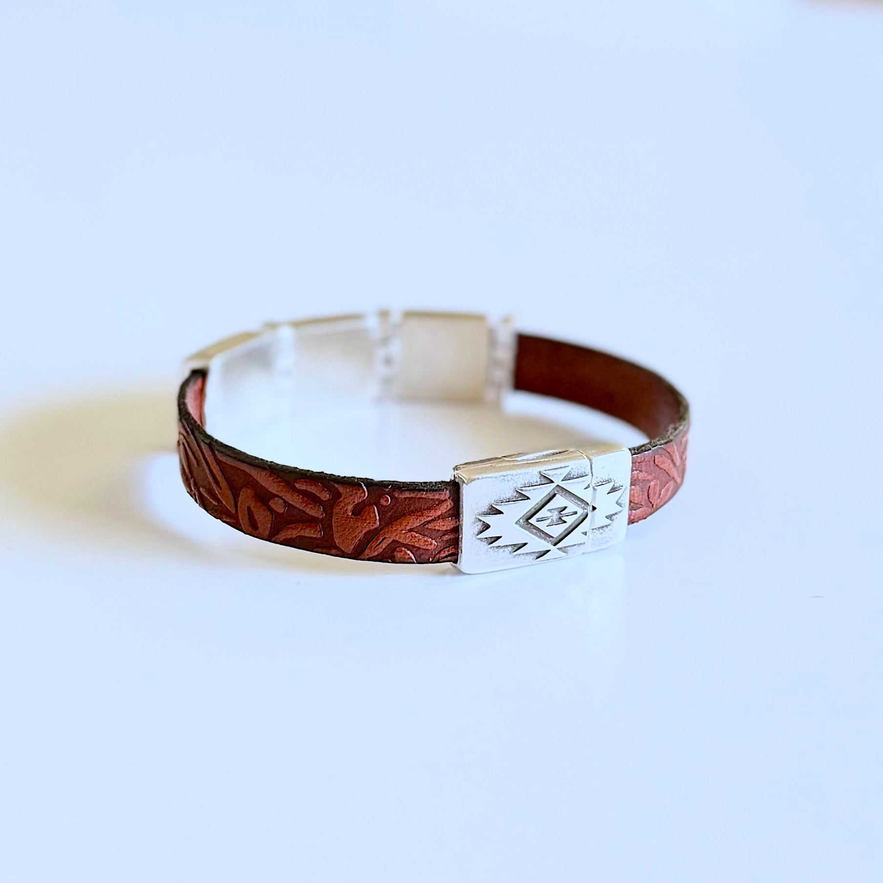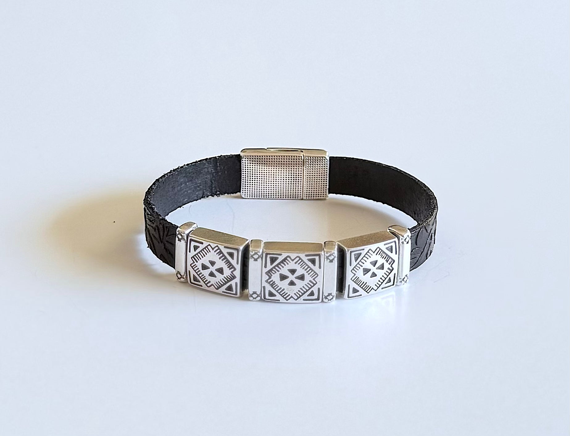 Olive Parker's bracelets are made to order.PLEASE ALLOW 5-7 DAYS FOR PRODUCTION TIME. Western heritage, wrapped around your wrist. Three silver square concho charms sit across a textured leather band, each...